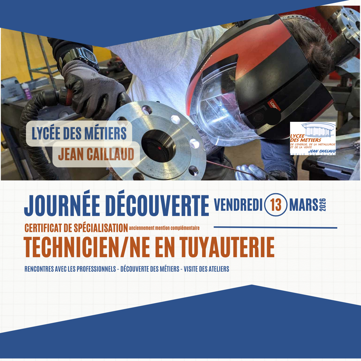Le 13 mars 2026, notre lycée organise une Journée Découverte dédiée aux métiers de la tuyauterie. Cet événement est l'occasion pour les élèves, les parents et toute personne intéressée par ce domaine, de découvrir les différentes facettes de cette profession passionnante et essentielle. Cette journée se tiendra en lien avec des experts du secteur et sera un moment de partage de connaissances autour des formations en tuyauterie.